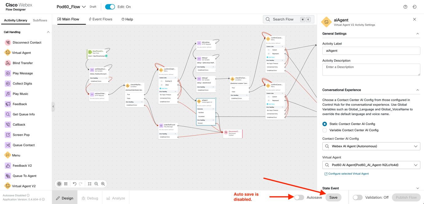 In the aiAgent settings, change the Virtual Agent to the virtual agent that was configured for your Pod in Lab 2. This is a drop down, so please select your virtual agent from the drop down.